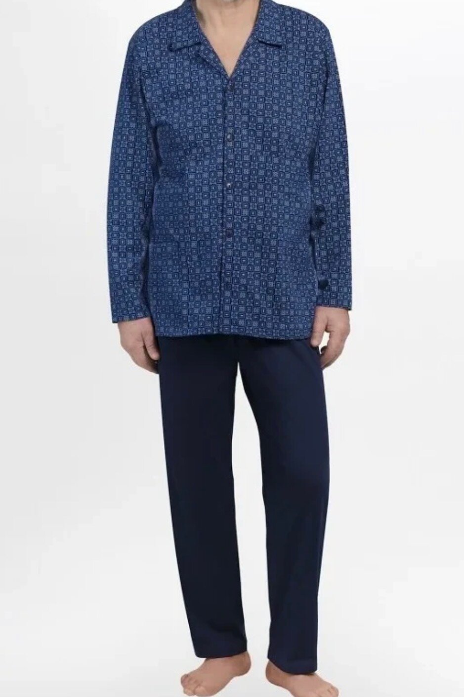 Vzorovaná blůza pyžama má límeček a zapíná se knoflíčky. Dlouhé jednobarevné kalhoty mají volný střih.